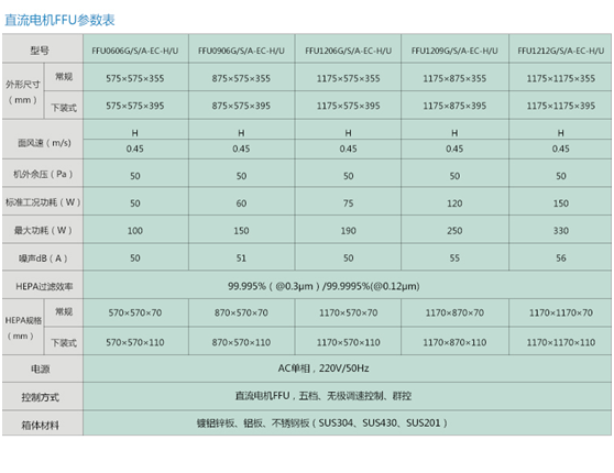 直流FFU性能特点: 1.采用EC直流电机,高效率、低能耗; 2.特殊的风道设计,风阻低,气流畅; 3.内部顺风导流通道,风压扩散稳定,出风风速均匀; 4.节能、环保、调速范围广;